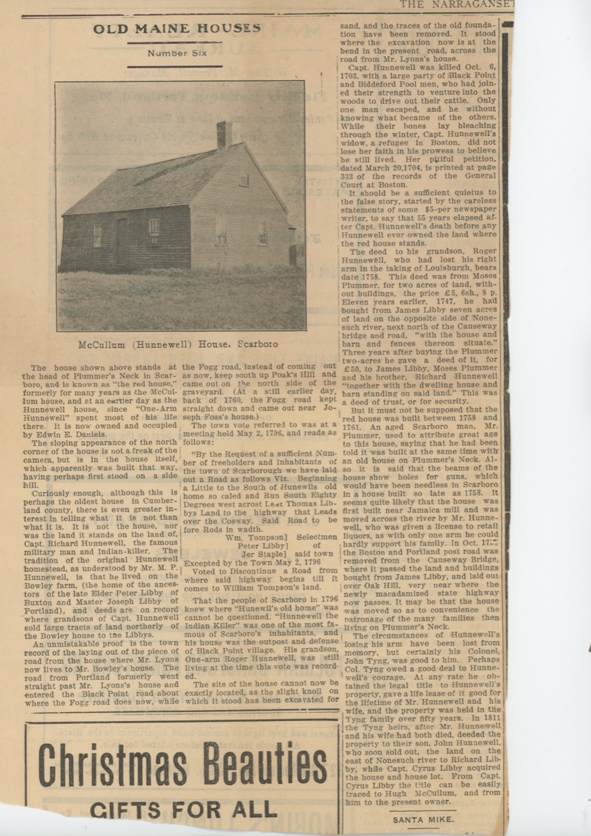 Sitting at the triangle of Black Point Rd, Winnocks Neck Rd, and Old County Rd, the historic McCullum (Hunnewell) House—also known as the “Red House”—holds a special place in the town’s story. Believed to be one of the oldest houses in Cumberland County, it was long associated with the Hunnewell family, particularly “One-Arm” Roger Hunnewell, a veteran of Louisburg.. This 1915 news article from the Narragansett [Times] explores the house’s construction, its changing ownership, and its connection to Captain Roger Hunnewell, who was killed in 1703 during a skirmish at Black Point. The “Red House” still stands as a symbol of Scarborough’s past, conflicts, and early Scarboro history.