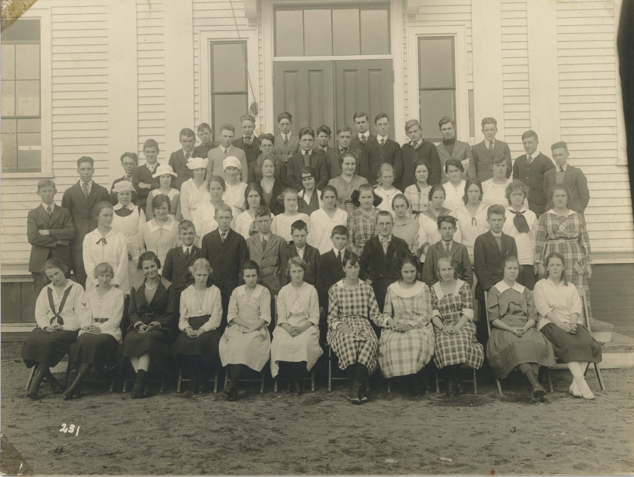 The photograph shown here captures a group of Scarborough High School students assembled in front of the White School, likely taken between 1918 and 1921. The young women wear long skirts, high-collared blouses, and lace details typical of the late 1910s and early 1920s. The young men are dressed in suits and ties, reflecting the formality of the era. Behind them, the clean lines and balanced windows of the White School provide a classic backdrop for this moment in Scarborough’s educational history.