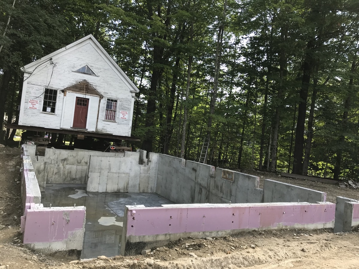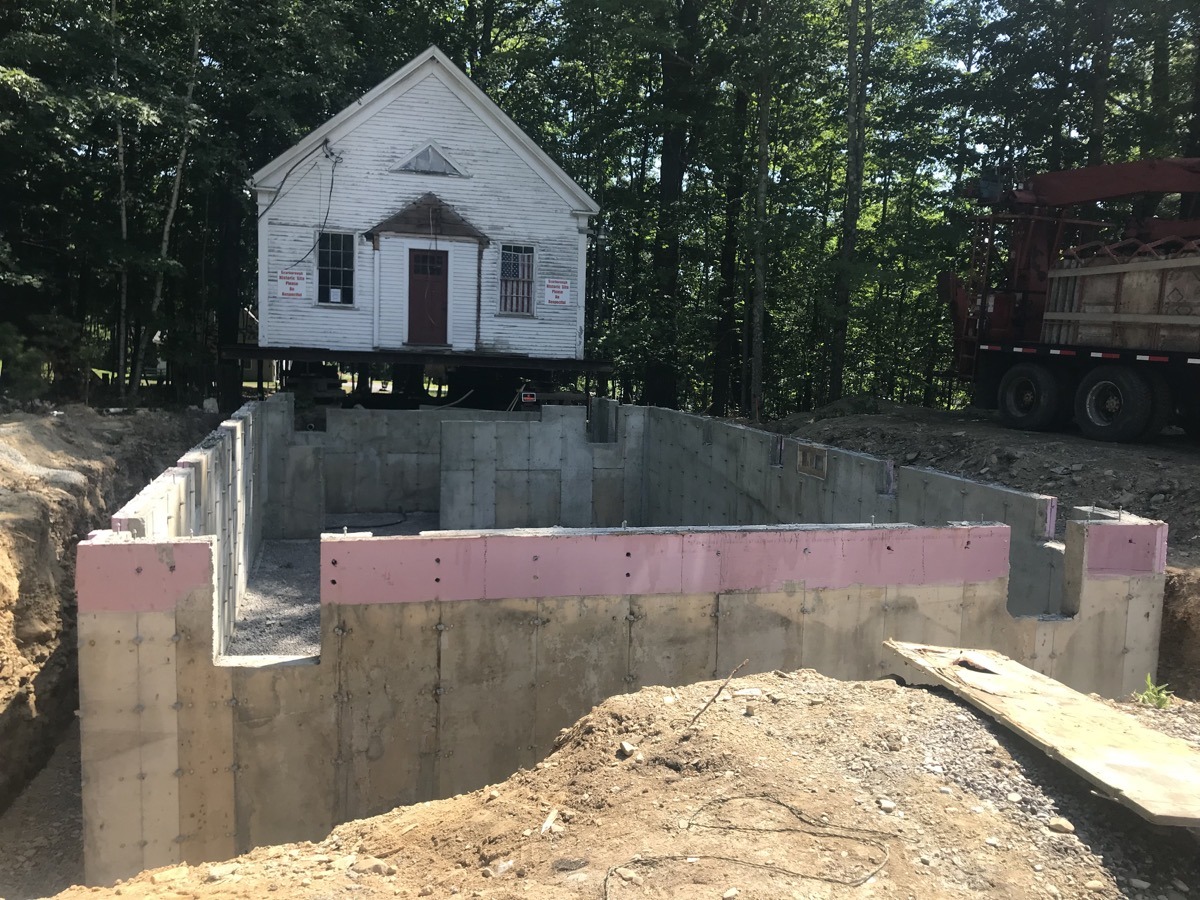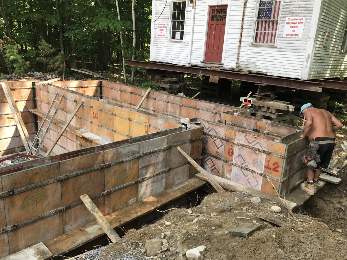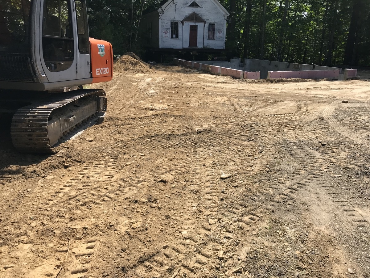 During the week of July 8th, Merry and Sons Movers began work on preparing the building’s move. Their goal was to move it in 4-5 days. The excavator asked that the building be moved from the area of the foundation and then moved back. Merry and Sons agreed to move in it back rather than to the side as originally planned, allowing more room for the foundation work to take place. Trees needed to be limbed before this move. Scarborough Public Works came quickly to our rescue. We truly appreciate their timely help.
