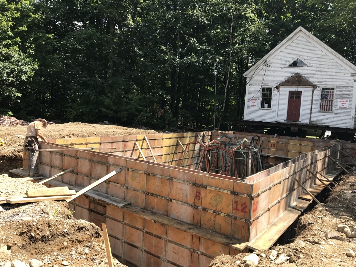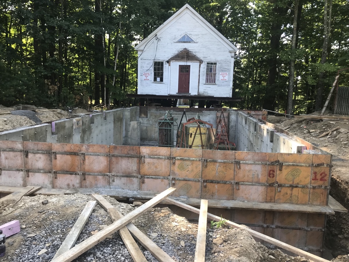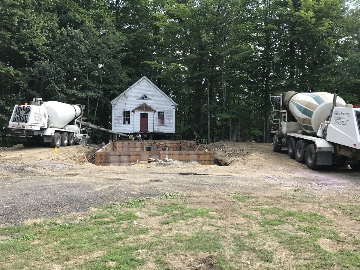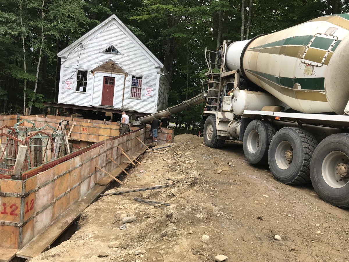 During the week of July 8th, Merry and Sons Movers began work on preparing the building’s move. Their goal was to move it in 4-5 days. The excavator asked that the building be moved from the area of the foundation and then moved back. Merry and Sons agreed to move in it back rather than to the side as originally planned, allowing more room for the foundation work to take place. Trees needed to be limbed before this move. Scarborough Public Works came quickly to our rescue. We truly appreciate their timely help.