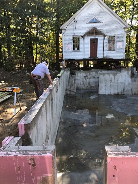 The Beech Ridge School now sits on cribbing and beams awaiting a new foundation. We are in the process of salvaging the original bricks from the rubble and cleaning them for use as a facing to the new foundation.